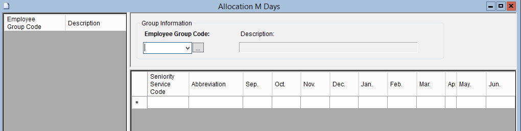 This screen is used to add, modify or delete “Work Days Required Per Month” Records. These records are required for any Employee Group Code & Seniority/Service Code combinations required to be worked by an Employee to be eligible for the full or part of the month's seniority/service credit of 0.1 year, that use the Algorithm type of M (refer to the screen Board Control>Seniority / Service>Seniority / Service Group). If using actual number of work days per month, this table must be updated annually to reflect the current year.