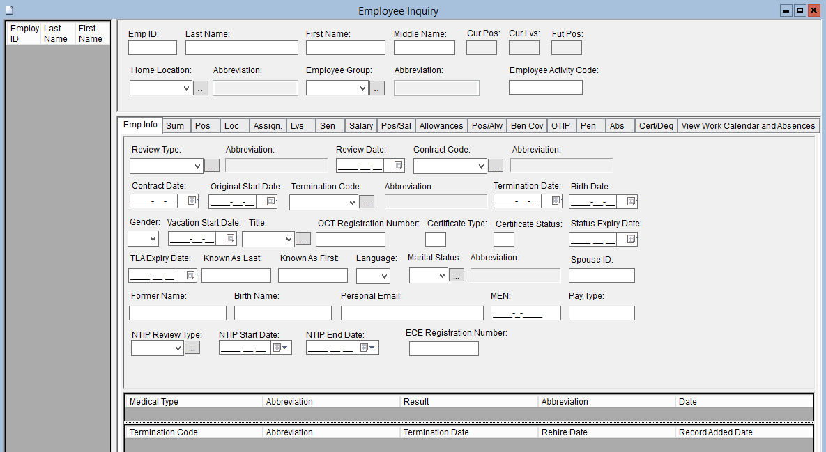 This screen is used to provide a single point of inquiry that can be used to view the majority of Employee information. This screen has no update functionality.