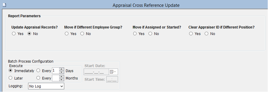 This screen runs using today’s date, it accommodates for those employees whose position(s) may change during a period when an appraisal record is still open, (e.g. a status of Active). Records can be updated immediately or at a later date, both options generate the Employee Cross Reference Update report.