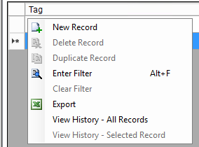 5. Select the Record that needs to be edited or right-click the grid below Tag and select New Record to add a new record