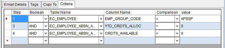 This tab is used to Add/Modify & displays the criteria used to determine the list of employees to send the email to as defined in the email text tab.