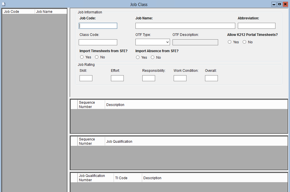 This screen is used to add, modify or delete a Job Code, Job Description, Job Qualification or Job Qualification TI Code at the Board level. Each Job Code contains descriptive information pertaining to each Board job (ie. a Job Description).