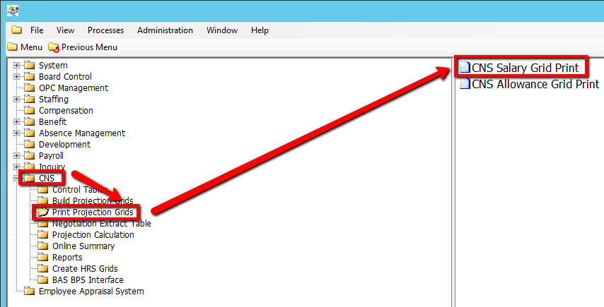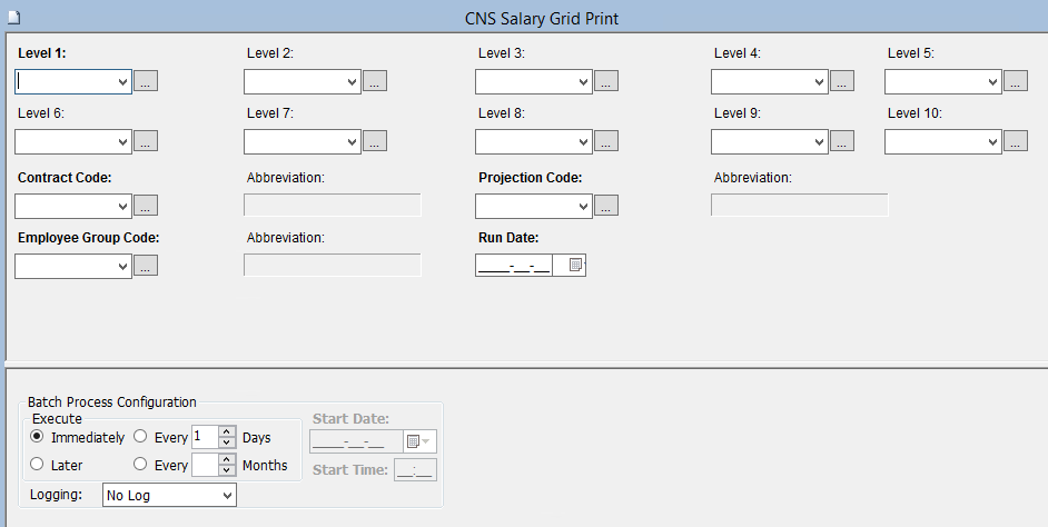 This process produces listings for all levels (up to 10) of a Salary Grid for a specified Employee Group. Before submitting this background process, you must specify the run parameters