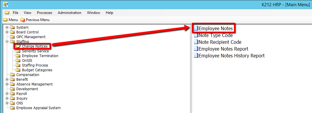 This screen is used to manage notes about specific employees. Codes are used to organize notes by Note Type and Recipient. Employee Notes cannot be deleted or modified, once they have been created and saved. You can add (but not delete) recipients to the note after it has been saved. Refer to the Change Notices Overview for additional details on this module
