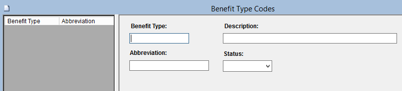 This screen is used to add or modify Benefit Type codes. Benefit Type codes used throughout the system are verified against this table.