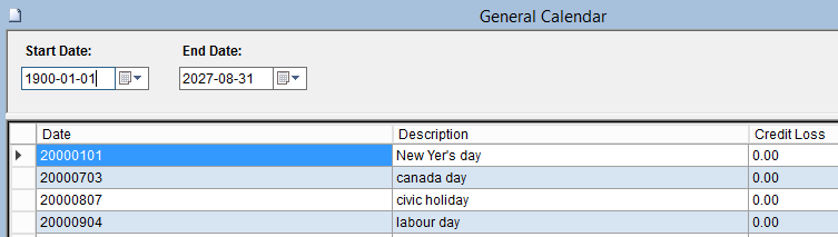 This screen is used to add, modify or delete exception dates in the Absence General Calendar. The purpose of the Absence General Calendar is to register all board-wide holidays (or free days) which occur within a specified range of days. By default the Absence System counts Monday to Friday as working days and Saturday and Sunday as non-working days, unless otherwise specified within the lower level calendars. For example, an Employee will lose one full credit for an Absence on a Monday but will lose no credits for an Absence on a Saturday. This logic is hard-coded into the system. The Absence General Calendar over-rides this logic for the dates and credit loss amounts specified.
