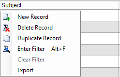 6. Right click the grid above the Subject column and select New Record. (Consult the user guides for more information about each field)