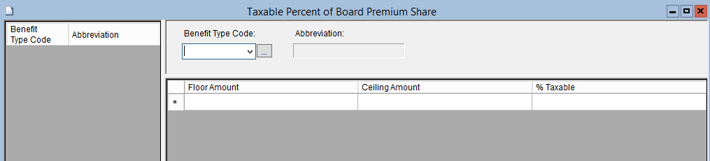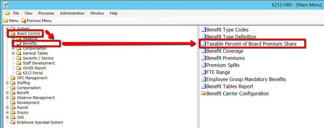 Use the following steps to Add/Modify Taxable Percent of Board Premium Shares to Benefit Type Codes: