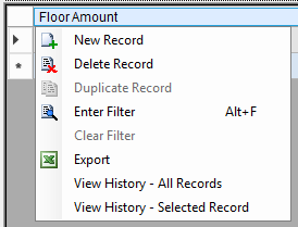 7. Right-click the grey grid below the Floor Amount column and Select New Record