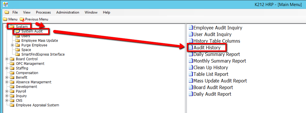 This screen allows the user to view activity logged in the audit history table for a specific employee. Records are moved to the EC_EMPLOYEE_HISTORY table from the EC_EMPLOYEE_AUDIT table by the Clean Up History process (which is also in the System Audit menu).