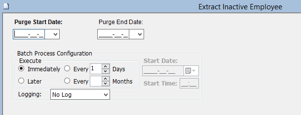This screen is used to extract Employee IDs to be purged from all tables in the data base and is based on the Purge Start Date and Purge End Date. The extracted Employee IDs are stored in the EC_EMPLOYEE_PURGE table and are used by the actual purge process.