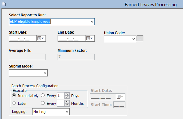 The second report, ELP Eligible Employees will compare Total Absences by Union Code to the Average FTE and Minimum Factor to determine if an employee is eligible for the Earned Leaves Plan.
