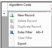 12. IF Algorithm Required = Yes then the Algorithm Code grid below will need to be filled out with all relevant information. Right-click the grid and select New Record to add Algorithm information