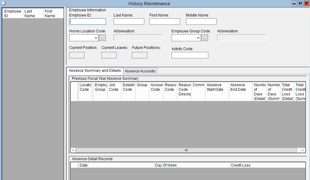 This screen provides the ability to modify or delete posted Absence transactions for an employee from previous fiscal years. This function also allows new Absence records (for a previous fiscal year) to be entered directly.