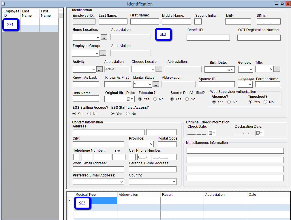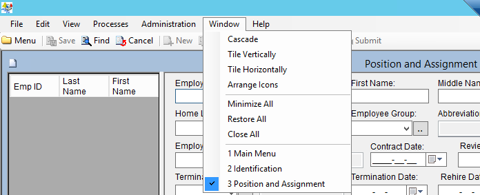 Each child window contains different functionality. For example, one child window might contain the Employee Identification function while another may contain the Employee Group Maintenance function. In this way it is possible to have two or more functions visible side-by-side on the screen together.
