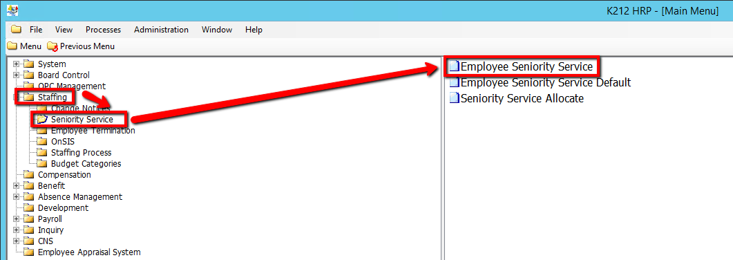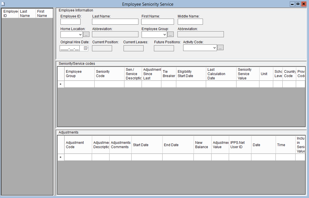 This screen is used to add, modify and delete seniority service information and make adjustments to an employee's service record between the periodic allocations of credits.