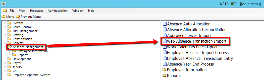 The Web Absence Transaction Import screen is used to perform the following functions: