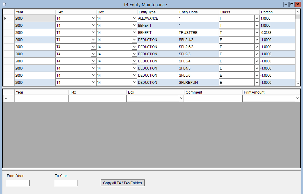 This screen is used to define the allocation of year to date amounts from the YTD tables to fill various boxes in the T4 and T4A forms.  Refer to K212 HRP.PAYROLL.RPT.ANNUAL.T4 & T4A GENERATION for details of the process that generates the T4s and T4As.