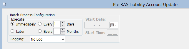 This background process is used to create entries in the accounting transaction file which will be imported to the BAS system. It updates the accounting table with liability codes for TAX, CPP and UI specified for each Revenue Canada code. This process must be run before the "Create BAS file" program to ensure that the correct Liability Account Codes are used for TAX, CPP and EIC if you have entered Liability Account Codes in the Liability Account Code screen
