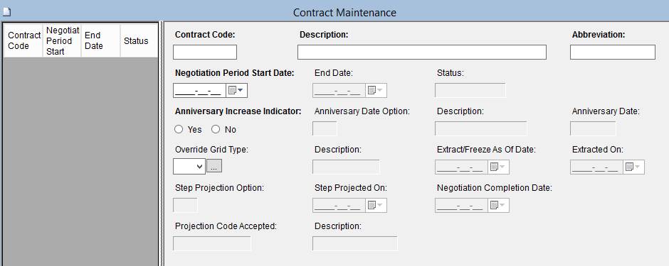 The Contract Definition Maintenance screen is used to uniquely identify each Contract to be negotiated. You can set up Contract Codes and enter information to be negotiated between the Board and the Union. Although Contracts generally run for 1 to 3 years, the system allows a maximum of 5 years for a Contract Code. This menu option also contains a list of all previous Contracts (ie. those that have already been completed).