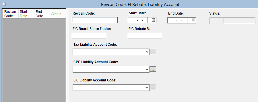 Use the following steps to Add/Modify REVCAN Code, EI Rebate, Liability Account Details: