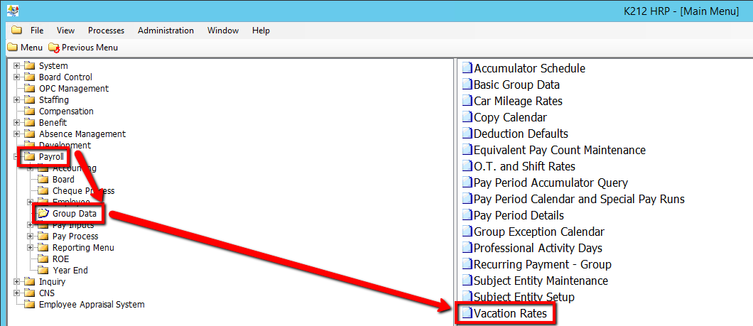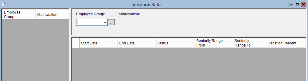 This screen is used to define the rates at which vacation pay is accumulated by seniority range, within each Employee Group. The Vacation Rates module is used to define the vacation rate percentages applicable to an Employee Group. Multiple vacation percentages are allowed if vacation rates are based upon a seniority range.