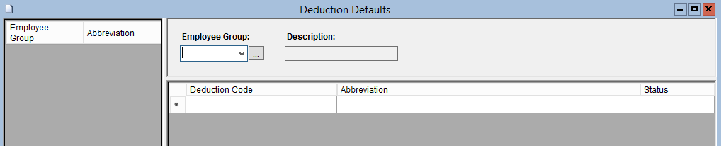 This screen is used to add or modify mandatory Deductions Defaults for Employee Groups. Each Deduction Default is represented by a unique Deduction Code, which must be established in the Deduction Codes Maintenance table in the Deductions function, under the Board Data module. A Deduction Default can be deleted. To activate or deactivate a Deduction Default, you can set the record status to A (Active) & I (Inactive).