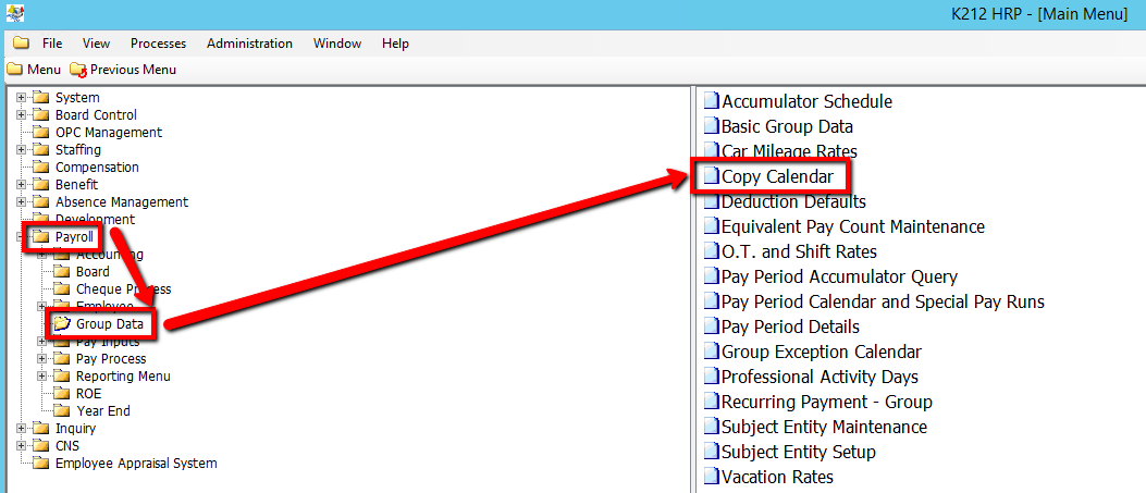 This menu option is used to copy a Pay Period Calendar from one Employee Group to another. It is used at the beginning of the year to duplicate Pay Calendars for the whole year for Employee Groups with the same pay calendar parameters (ie. payment method, pay type, number of pays and calendar exception codes). This facility reduces the time required to define multiple calendars for multiple Employee Groups with identical pay period parameters.