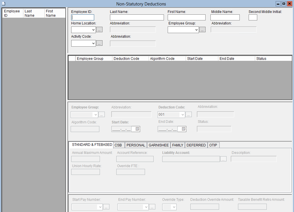 11. Depending on the Algorithm Code for the selected Deduction Code, A specific tab (STANDARD, CSB, PERSONAL, GARNISHEE, FAMILY, DEFERRED, OTIP) will open field that can be modified. All Other tabs will remain inaccessible.