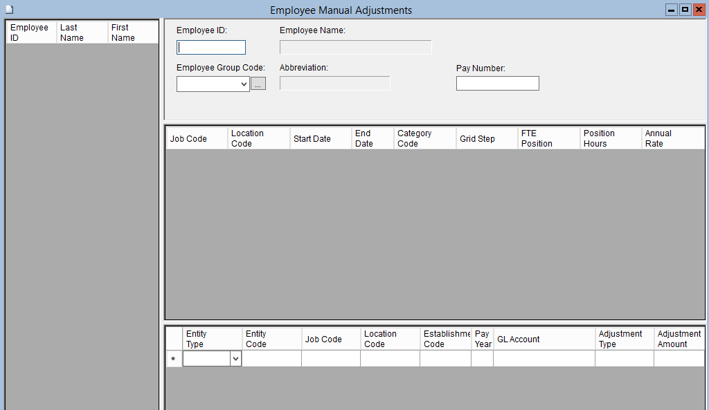 This screen is used to enter manual salary and allowance adjustments. Manual Adjustments are not included in further Entitlement or Authorization processes.