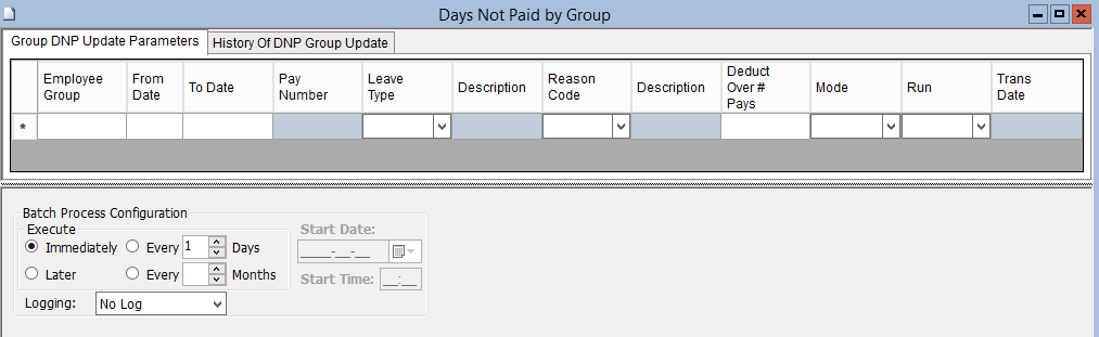 This screen is used to create Days Not Paid records at a Group Level. This screen is used to identify the date(s) for which a group of Employees will not receive payment (Eg. for an unpaid absence etc.). It finds the appropriate position/salary for which to deduct days not paid.