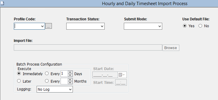 This screen is used to run a background process that imports hourly or daily timesheets. This background process uses the rules created in a user-defined Import Profile in order to know how to import data in the file.