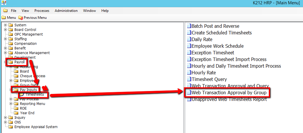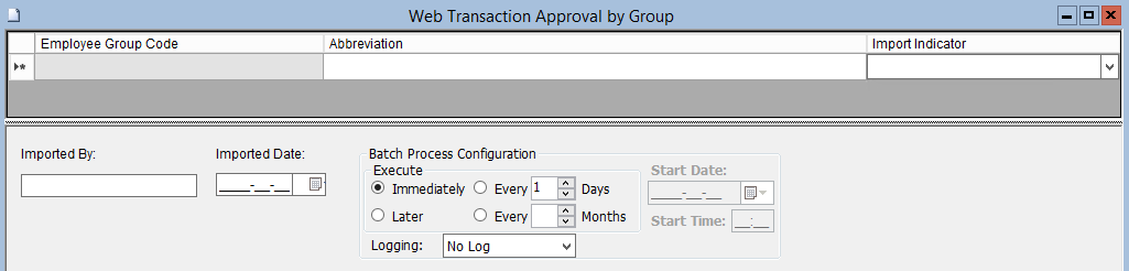 The Web Transaction Approval by Group screen is used to import approved web transactions into Timesheet Batches