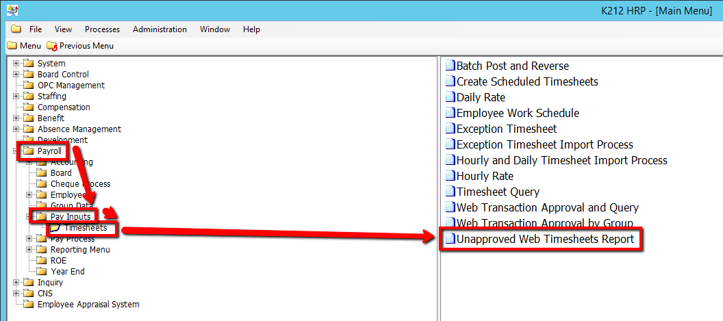 This module produces the Unapproved Web Timesheets Report; which contains a list of Employees that have entered timesheets in the K212 portal, that have not yet been approved by their Supervisors.