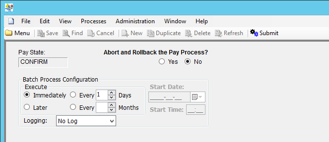 When this process is submitted, all of the processing performed by the pay run will be reversed on the database and the Pay State will be changed back to SCHEDULE. The Pay may then be re-run from the beginning if required.