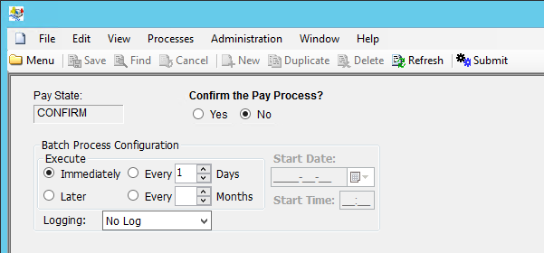 When this background process is submitted, the Pay State will be changed to SCHEDULE and the pay can no longer be aborted / rolled back.