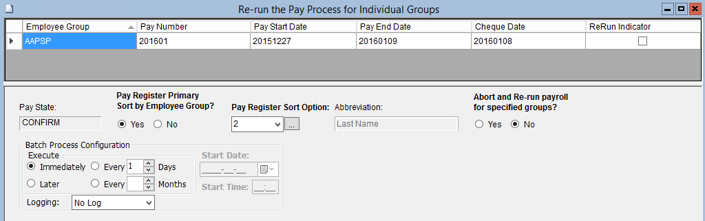 This screen is used to abort/rollback and then rerun the pay for one or more Employee Groups and cannot be submitted unless at least one Employee Group is selected and the Pay State is Confirm or Rerun.