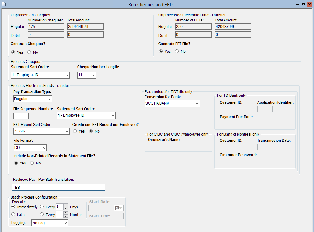 This screen is used to print cheques and to produce an EFT transaction file for any payments that have been generated from a pay run but have not yet been printed / produced. The top of the screen displays the number of payments in each category that are waiting to be made.