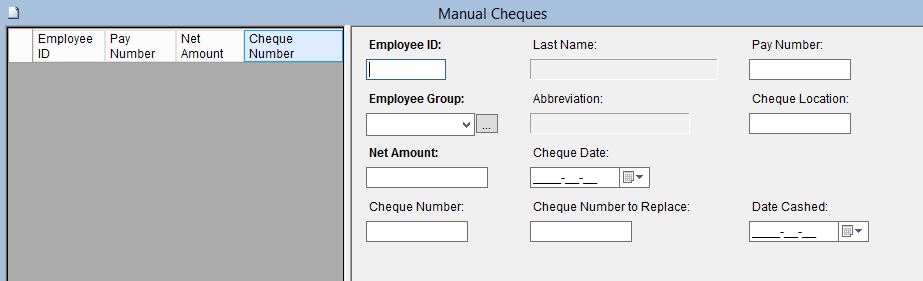 This screen is used to add and delete manual cheque records. Manual cheques are issued outside of the normal pay process, although the amount issued can be deducted from the following pay. If adjustments are required to YTD amounts (for T4s, etc), this must be done manually (i.e. this function cannot be performed here).