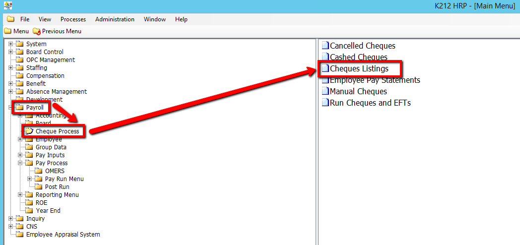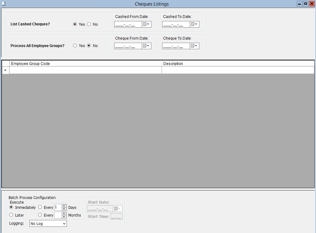 This process produces a report of all cashed and/or un-cashed cheques, maintained in the cheque file. It contains several optional parameters (see below) to limit the number of cheques included. Only records with payment type equal to CHEQUE are included in the listing. Cancelled cheques are excluded.