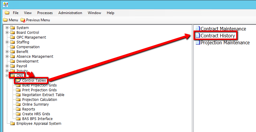 Use the following steps to View CNS Contract History: