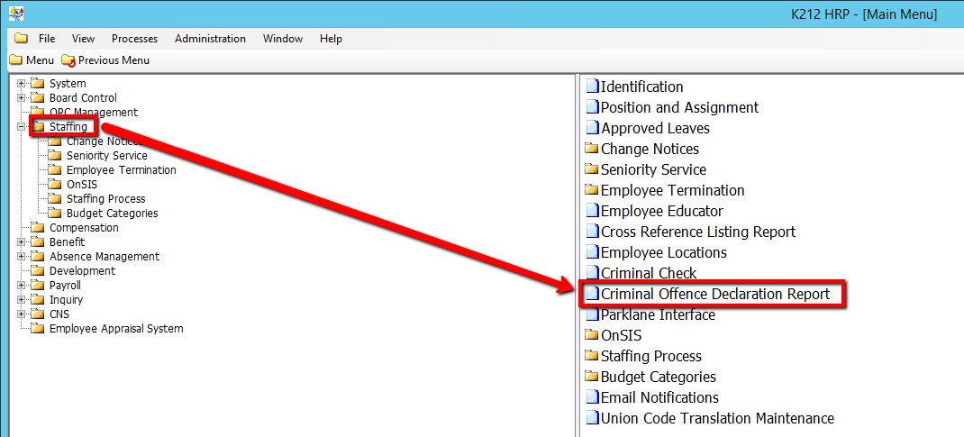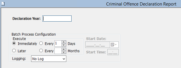This screen is used to generate the Criminal Offence Declaration Report. This process copies existing data from the K212 Portal and reports all records included in the Declaration Year selected.