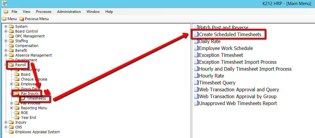 This screen is used to create Scheduled Timesheets for the purpose of populating the Hourly Timesheet Entry Component on K212 portal and produce the Employee Scheduled Timesheet report and Employee Scheduled Timesheet Error report.