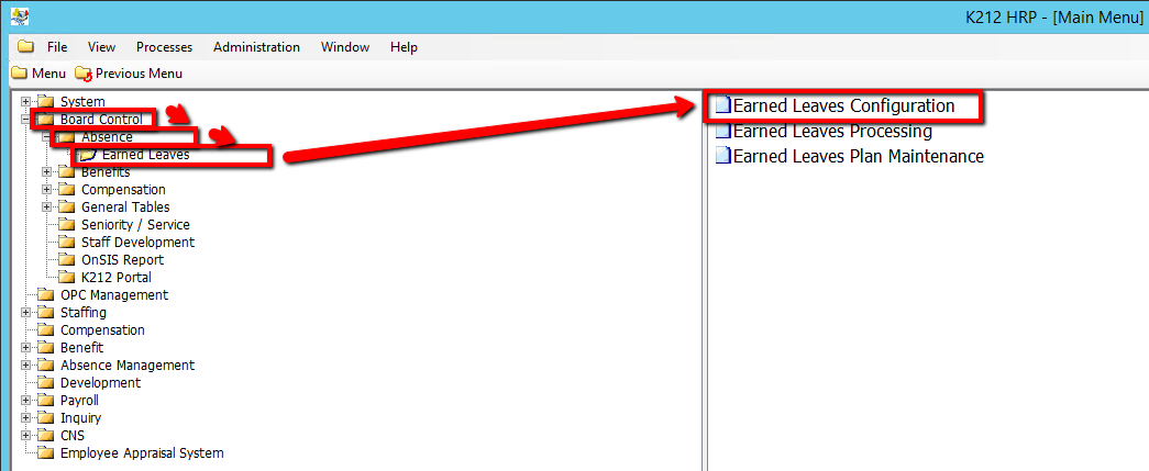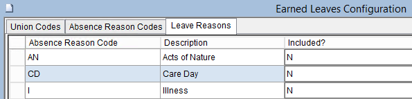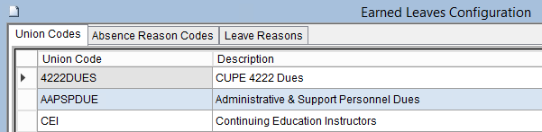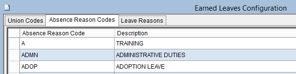 The Earned Leaves Configuration Screen is used to define the eligible union codes, absence reason codes and leave reason codes used in the Earned Leaves Plan Processing Screen.